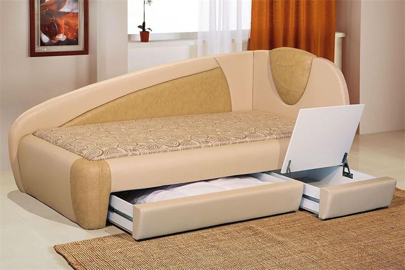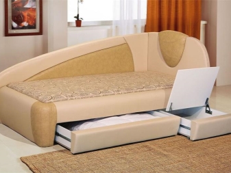 Ancient couches resembled a soft stove bench, which had no headboard. Over time, these sofas have been improved. They got the details that make them more comfortable: the back appeared, the number of legs changed, they became smaller, then they disappeared altogether, they began to use the space under the bed for storing things.
