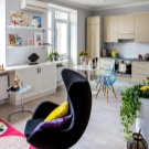 The best choice for small apartments is the Scandinavian style. It is performed in light gray tones, sometimes with the addition of white. A distinctive feature of this design is the presence of a large number of bright colors. The contrast appears only in the details; it can be a bright clock, rugs, toys.