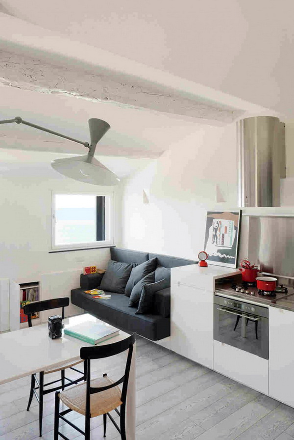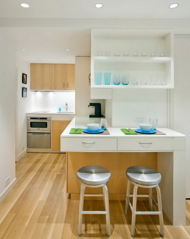 Usually in studios the kitchen is combined with the common living space. Do not worry about the fact that smells will penetrate into your bedroom and spoil pieces of furniture. Enough take care of the availability of high-quality ventilation system, a prerequisite - its proper operation. Saving is strictly prohibited on this element of the cooking zone; it is extremely important what microclimate will be in the apartment,since air has a direct impact on human health.