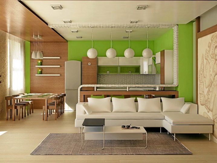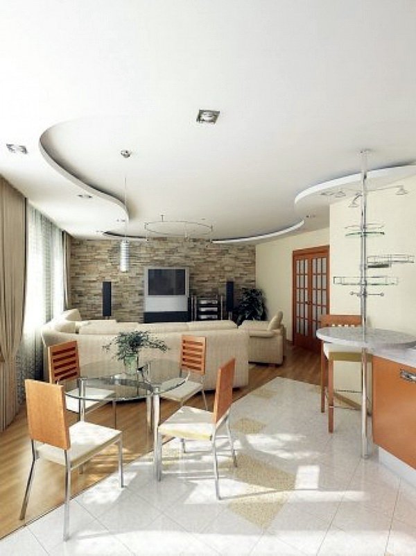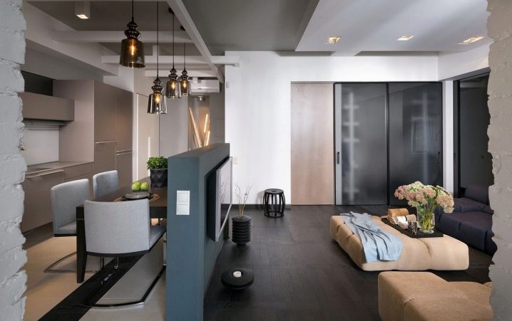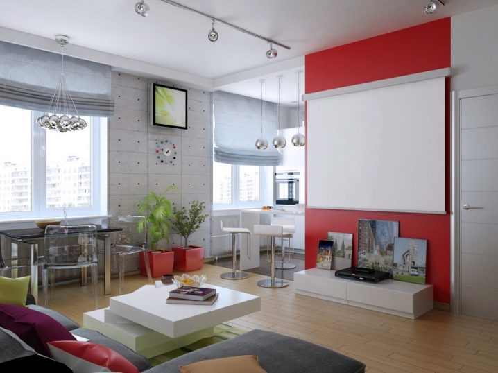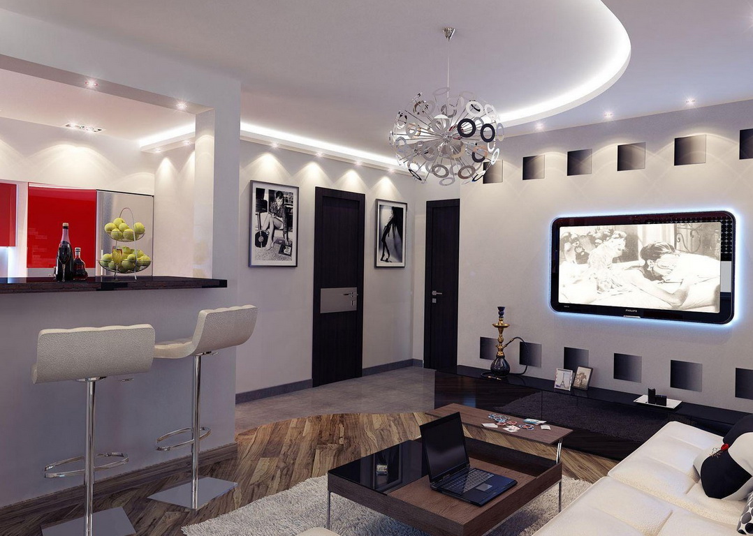 In such a living room you can always give free rein to your imagination. Fans of movies can make a big cinema out of their homes, and music lovers will hear their favorite tunes in the kitchen.An open plan is a dream of almost any bachelor, because it easily holds large parties, and from the refrigerator to the bed - just move it by hand. And for creative people here is just a flight of fancy - from placing a small art gallery to experimenting with pieces of furniture and their colors.