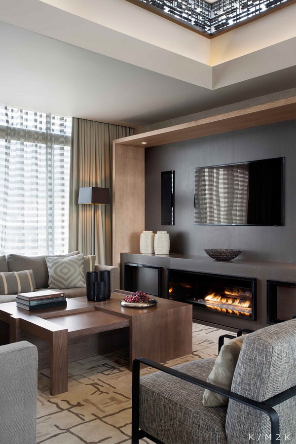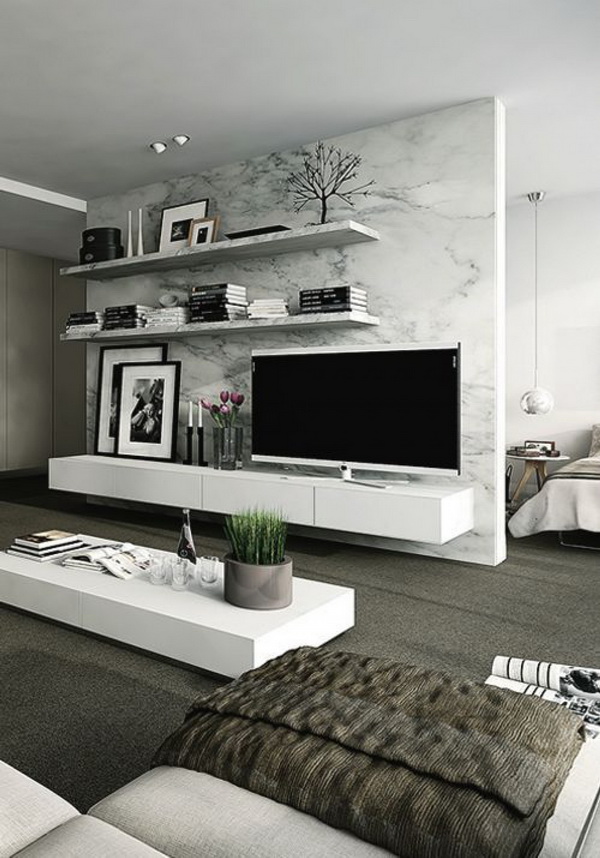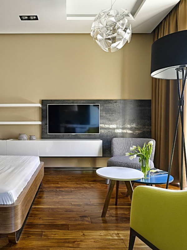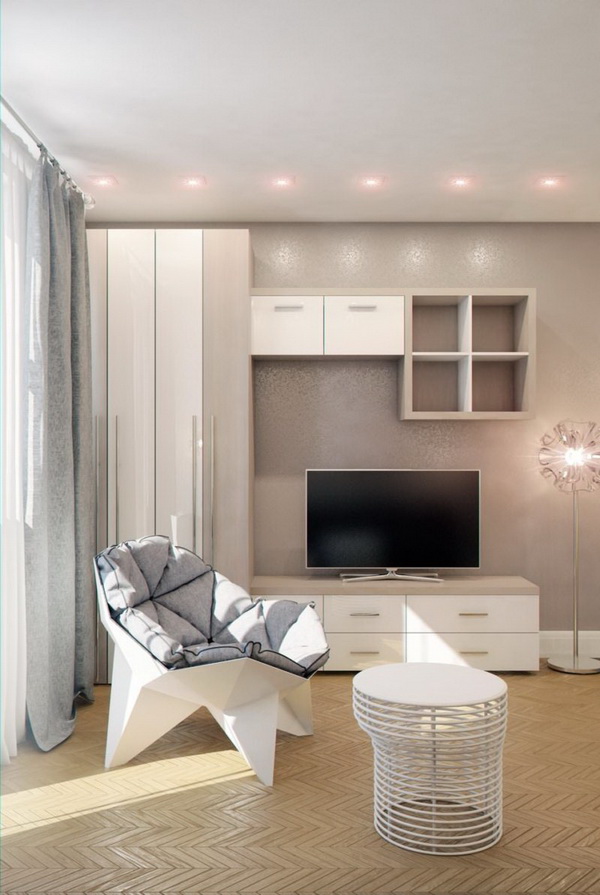 A place to sleep is usually placed in front of the TV. To make the layout more practical, it is better to embed TV in the wall, place your favorite photos, souvenirs, documents and books in the same place. Buy a separate cabinet is not desirable. When you purchase a plasma, it is placed on a special stand or simply mounted on the wall.