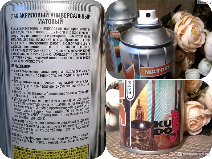 The advantage over standard liquid varnishes is mobility and speed of application by spraying, while you do not need any additional tools. The spray is spread over the surface in a thin layer, due to which it dries quickly. Aerosol sprays are both colorless and color.