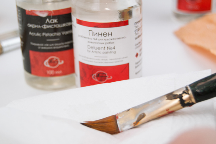- Varnish - it is a resin mixed with an already known solvent. Thanks to the lacquer, the paintings become brighter and more dense. Thanks to this mixture, subsequent solvents are made - a double and a tee.