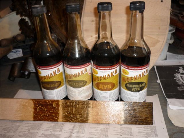 Wood stain can be made independently.The combination of various natural ingredients gives certain shades. Changes in proportion leads to a change in shade.