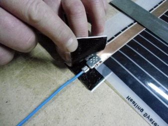 One end of the contact clip is introduced into the cavity separating the film from the silver strips, the other is fixed on a copper base and pressed with pliers. Successively moving, all contacts are processed in this way. Do not forget to isolate the connection points! The temperature sensor should be attached to the bottom side of the black strip, it is held by bitumen insulation. remember, that Thermal bands must be at least 10-50 centimeters from any heating devices, depending on the heating power.