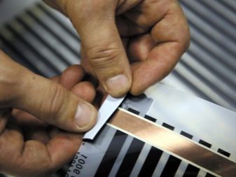 Direct the strips with contacts to the side where the thermostat will stand, and in no case do not overlap one thermal film with others! Since it is required to connect the wires in parallel, it is possible to assemble them in one side and disguise them with a plinth. The film at the time of installation is glued to the substrate with tape, otherwise you can tear it.