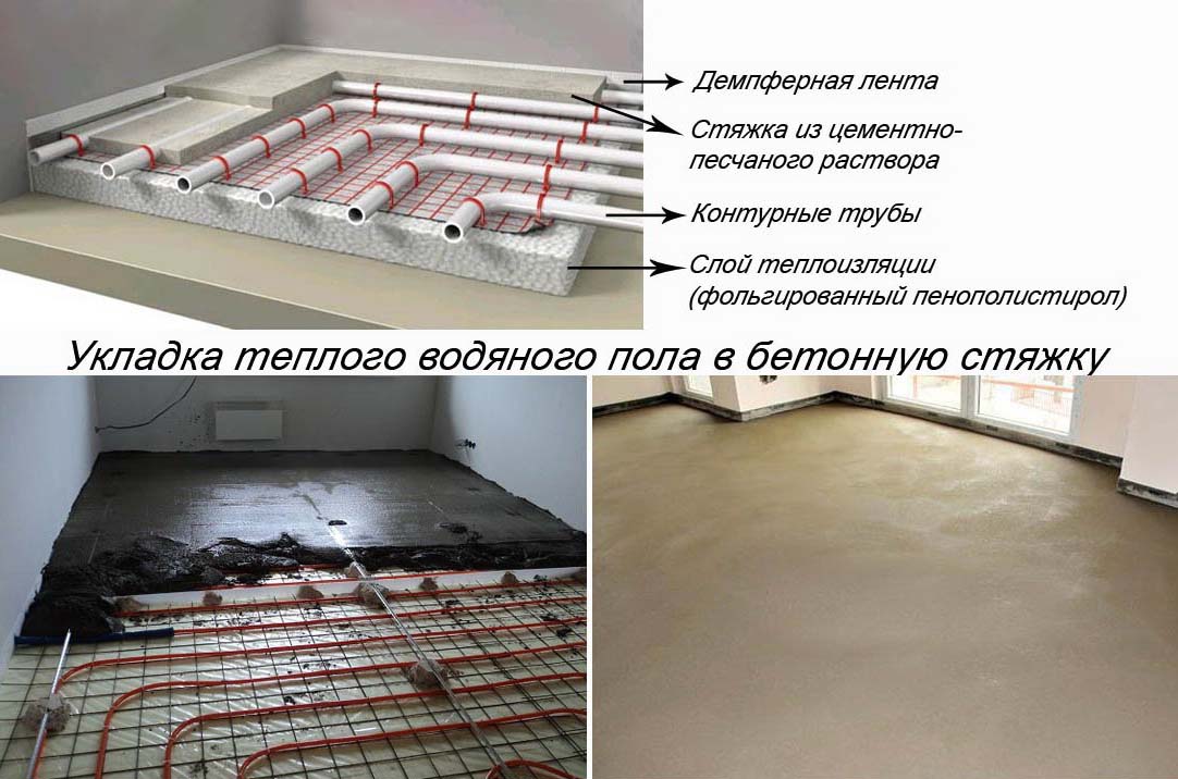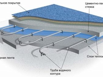 Water heating systems are always multi-layered. The base is made waterproofing, then there is thermal insulation (it does not allow heat to go down). Later, pipes of small diameter, covered with a base layer - a concrete screed, occasionally with gypsum fiber, are being installed. And only then comes the turn of the actual flooring. The type of overlap determines the thickness of the whole structure, ranging from 5 to 15 centimeters.