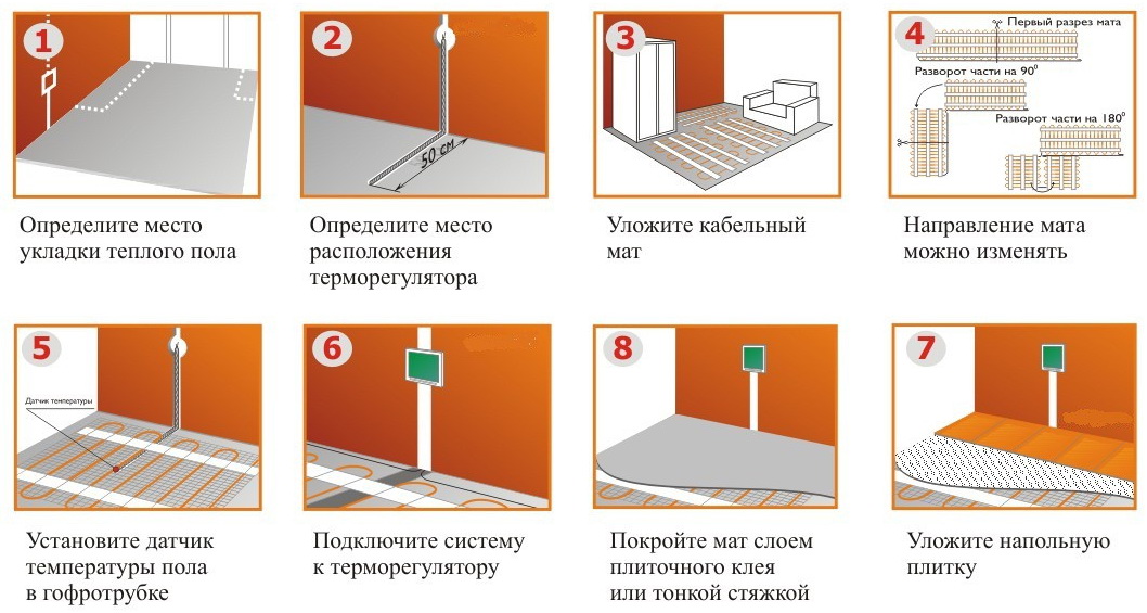 Work will be significantly simplified if you use heating mats. First, determine where the thermostat will be, and lay the cable in accordance with the manufacturers instructions. When the sensor is fixed, the thermostat is set, a test run of the system is carried out. If everything is in order, you can pour the coupler from 3 to 10 centimeters thick. After pouring it is required to wait a month, and only then the screed will be strong enough for laying the laminate.