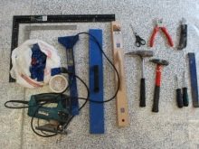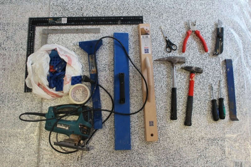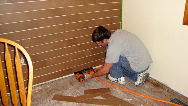 To install a laminate with your own hands, buy an electric jigsaw, it will help to cut the panels as accurately as possible, and later it will be useful for other works.You will also need consumables, a tamping hammer, a short (up to 40 cm) ruler and a square, a tape measure, restrictive wedges, a tamping block, a bevel cutter, a saw, a drill and a perforator. To finish the laminate wall, which was previously covered with wallpaper or painted, using a spatula or a perforator with a nozzle, the coating is removed. The final removal of irregularities is achieved with sandpaper.