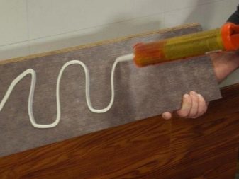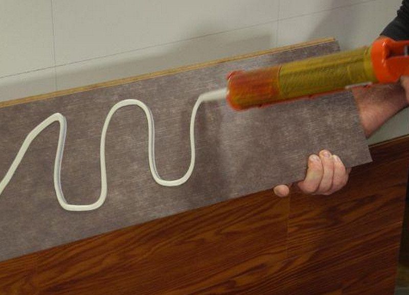 Fastening adhesive laminate should occur on a flat surface. For holding use liquid nails or construction silicone. The seamy side of the panel is covered with glue in the form of a zigzag, after laying the strip with the same glue, they coat the end, and proceed to the next chain. If the glue liquid has protruded on the boundaries of the blocks and lines, it is immediately removed with a soft cloth made of natural fabric soaked in cooking acetic acid.