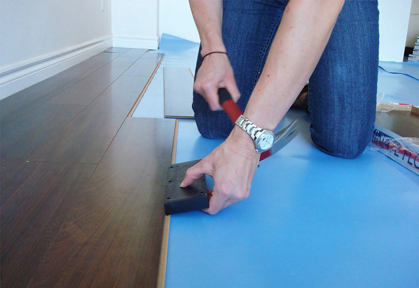 Laminate, becoming more wet, swells. And therefore, no matter what method of installation you choose, be sure to make a gap of 1.5–2 centimeters from the corner over the entire perimeter. Splitting wedges on the walls can help with this, but there is a far better solution. Bottom put completely flat boards or slats of the required thickness, which are wrapped in a thin plastic film. And on the sides you can already safely use the wedges, there they will not be squeezed out by the weight of the skin.