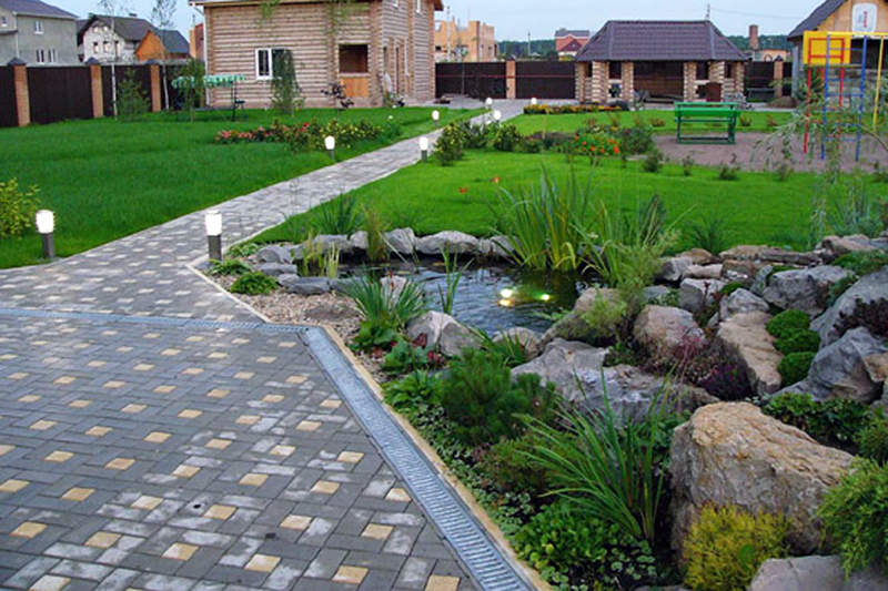 If you ride bikes or own your own car, you will also need a driveway. On both sides of it, you can lay stones, plant flowers or even low thuja.