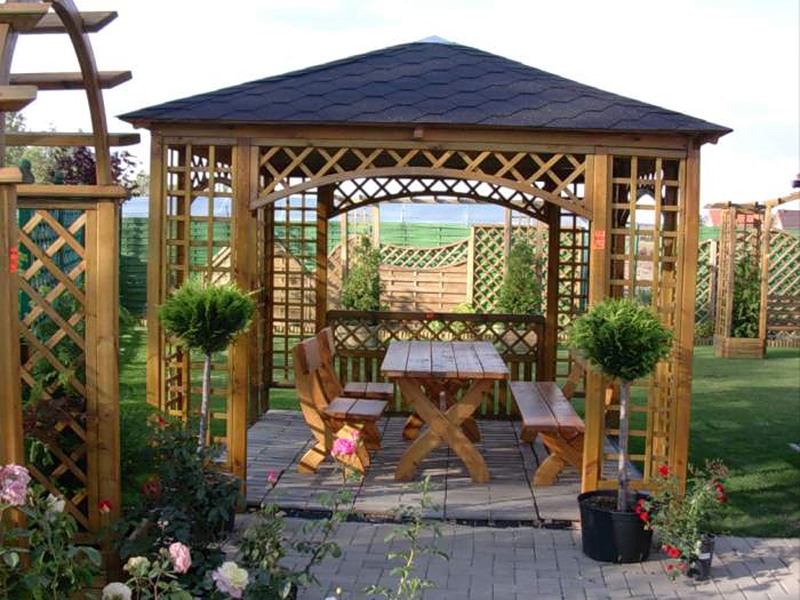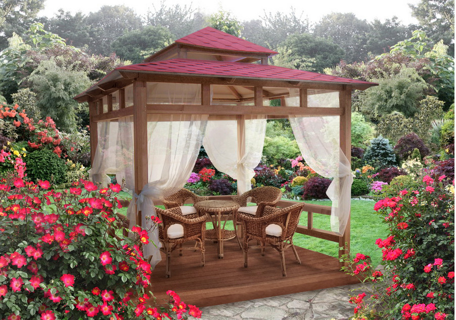 Even in the village you need to be able to relax well. On the rural plot there is no place for a refined gazebo with luxurious decor. It is worth replacing it with a simple wooden table, surrounded by wicker chairs, and covered with a canopy.