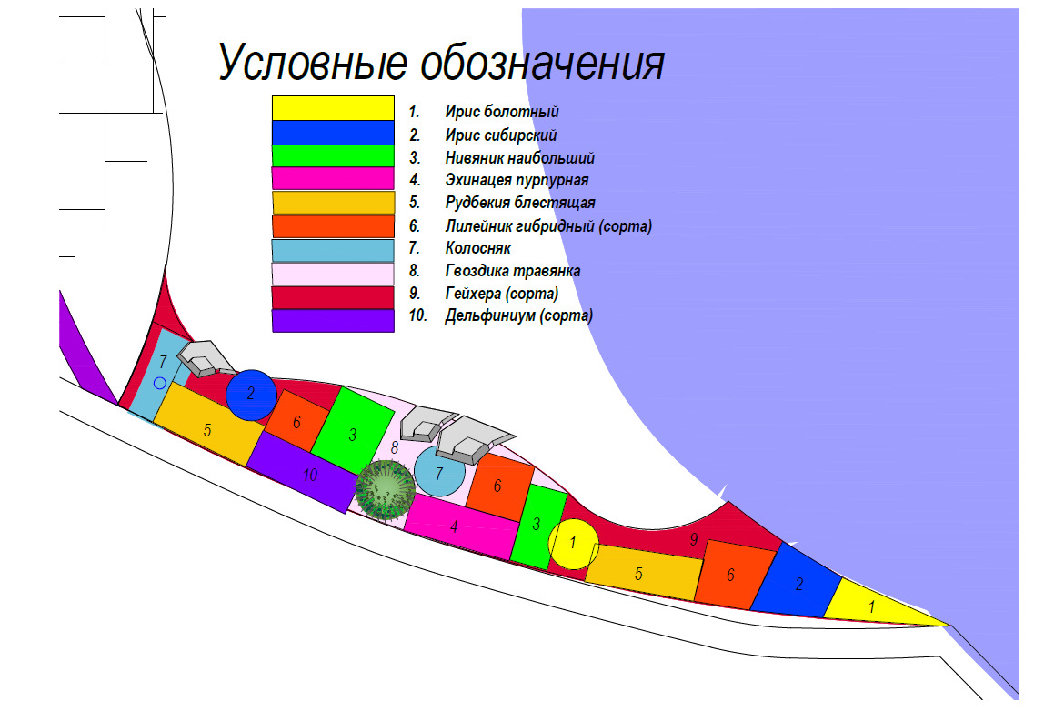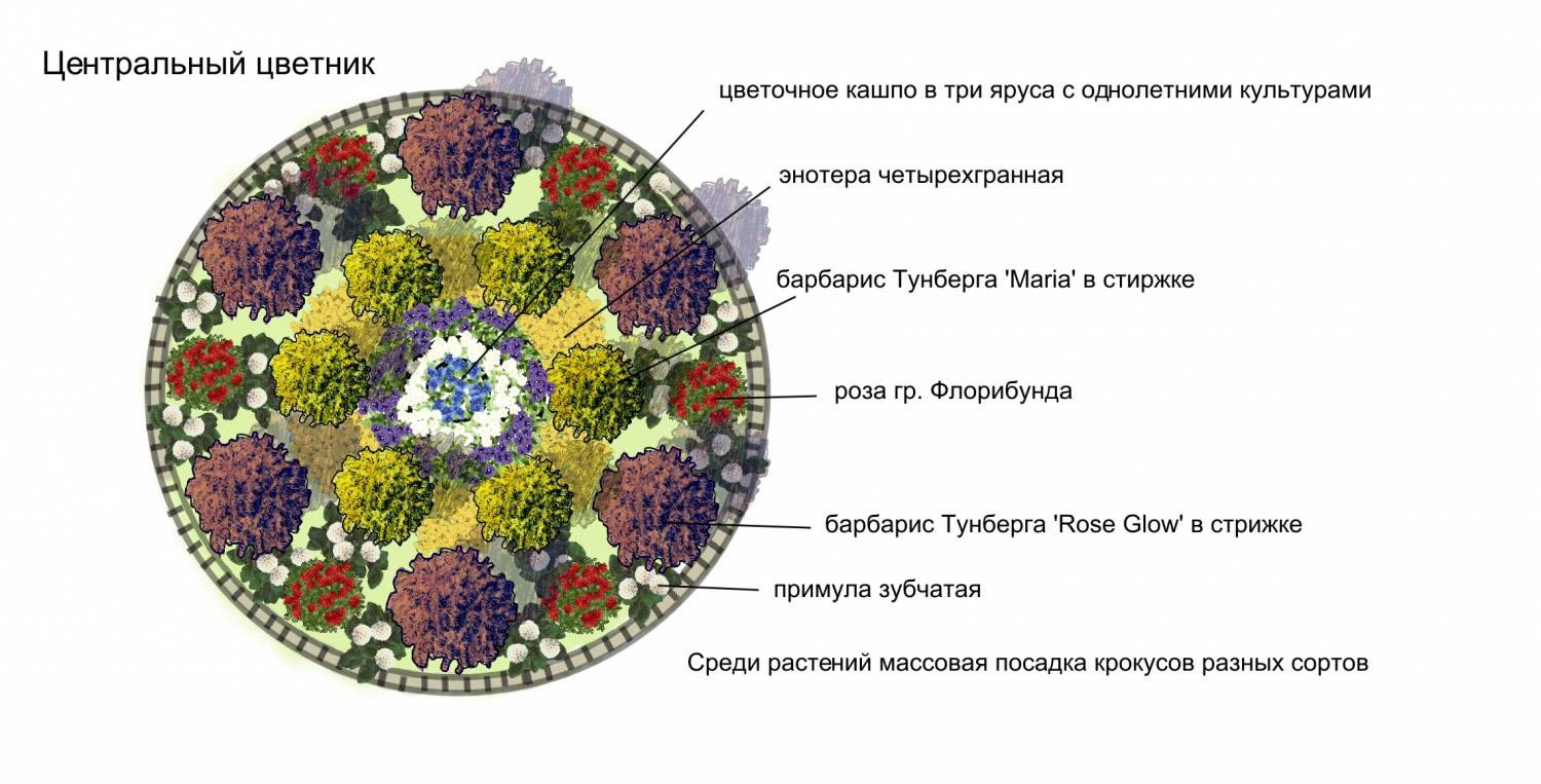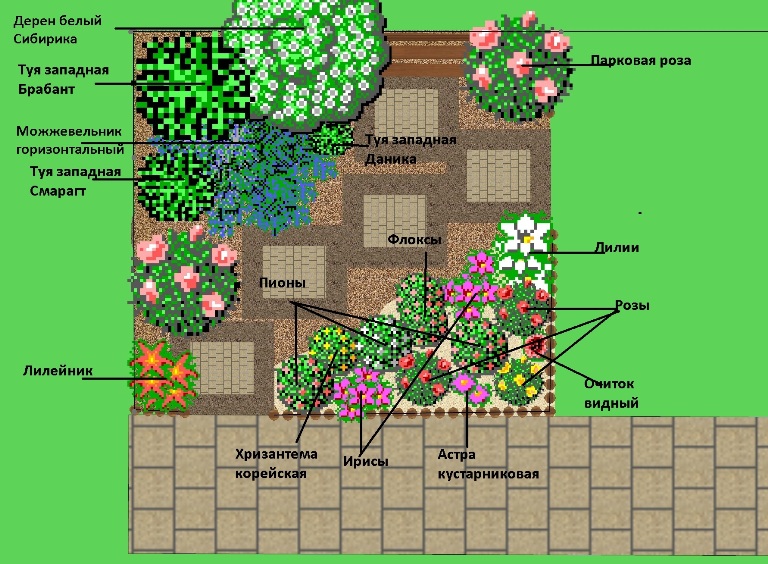 Based on these data, you need to determine the locations of flower beds and plantations, determine their style, shape, size, make a color scheme. Choose the right plants.