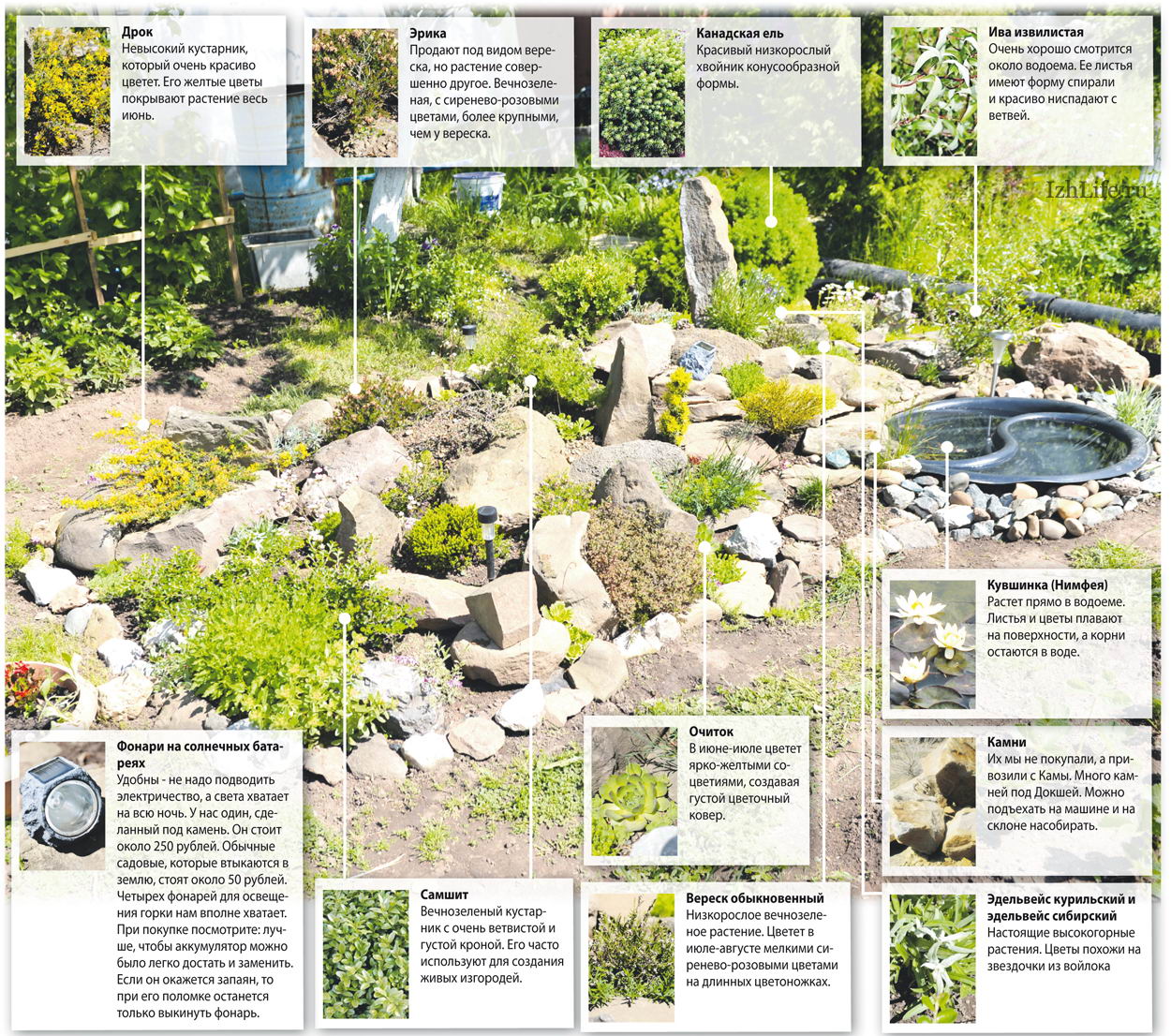 - Rockery - a modern element of landscape design, designed to combine the beauty of living and inanimate nature (stones and plants). It can be made in Japanese, European and English styles. Can be placed on a flat or slightly elevated platform. Types of rockeries: stable, temporary, changeable.