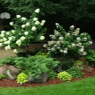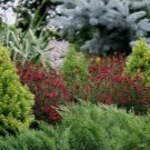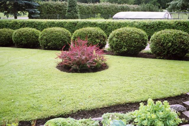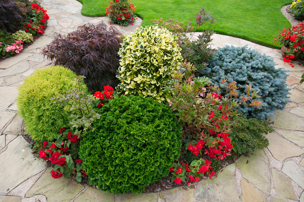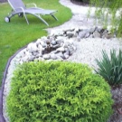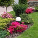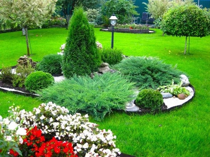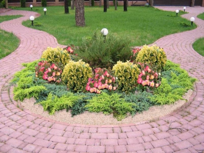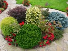 - A symmetrical flowerbed is planted from the center, where the tallest plant is located, descending through 1-2 plants of medium height to the lowest growing - creeping species of thuja and juniper.