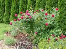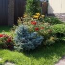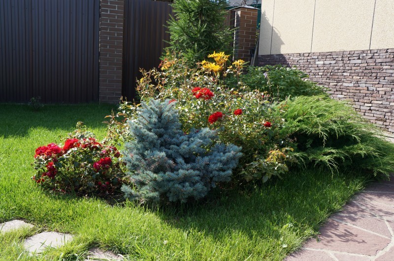 Despite the fact that conifers are often picky in terms of environmental conditions, they are quite intolerable to other plants and to each other. So, one should not plant cedar, pine or thuja near spruce and fir, and larch will not tolerate any other conifers next to them. Birch or bird cherry are also undesirable neighbors for them, since they will take away all the nutrients from the soil. The bush and single roses always look spectacular and stylish against the background of conifers. However, in such a combination, the flowers are endangered by alkalization of the ground, so they need regular fertilizer.
