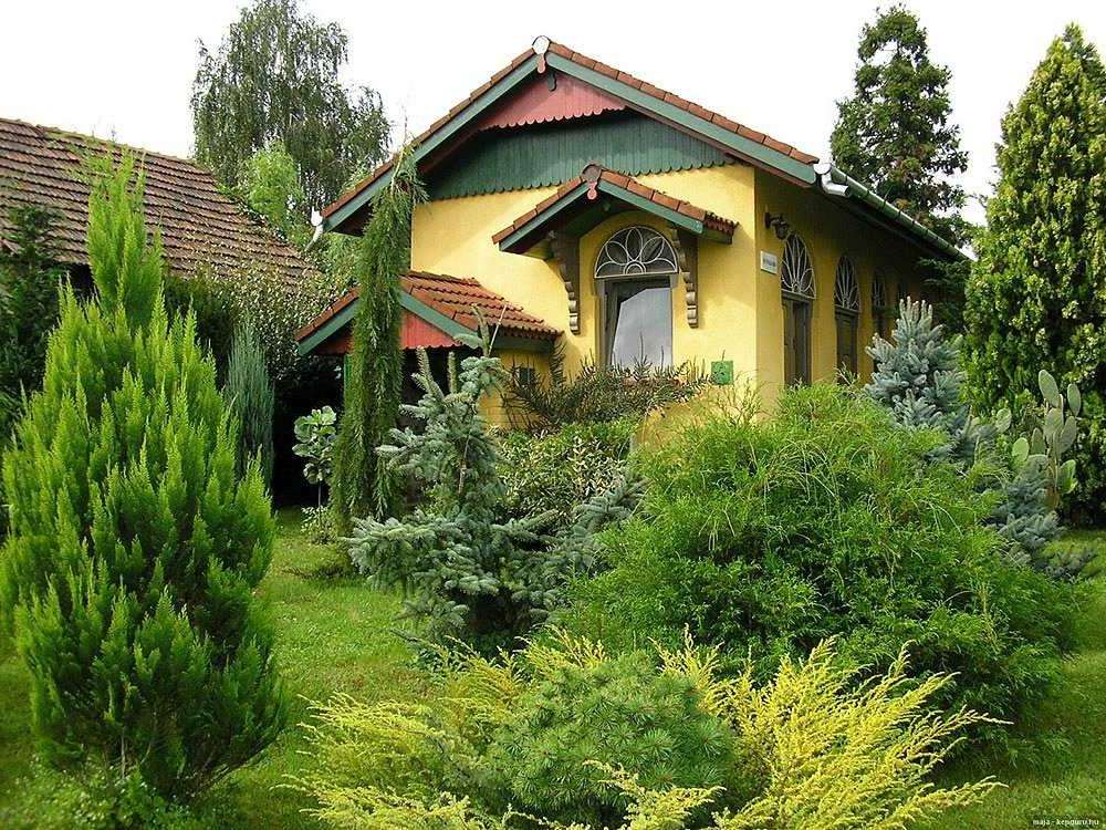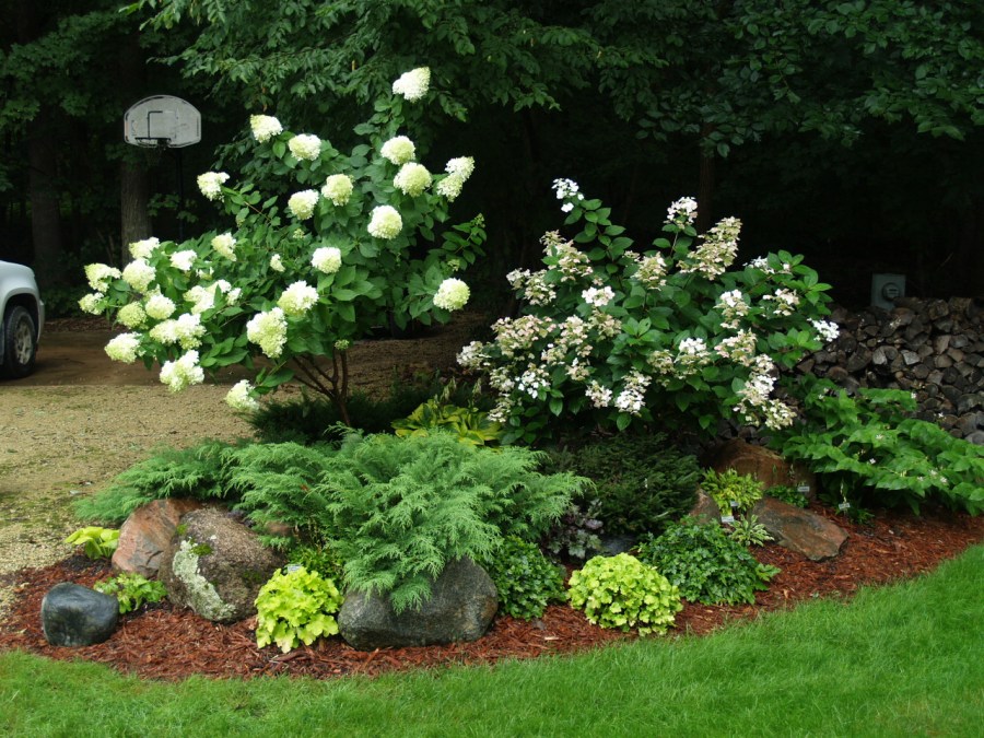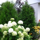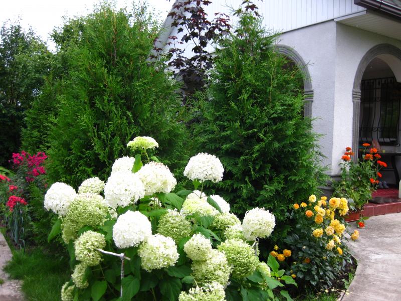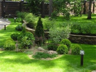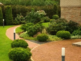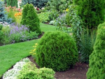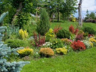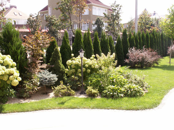 A beautiful and successful symbiosis is formed in conifers with deciduous shrubs, herbs and perennial flowers. The hydrangea or rhododendron will always be the winning choice.The classic ideal combination is considered a simple combination of conifer and grass lawn.