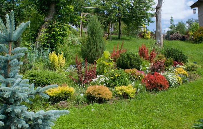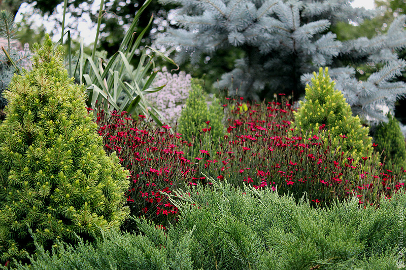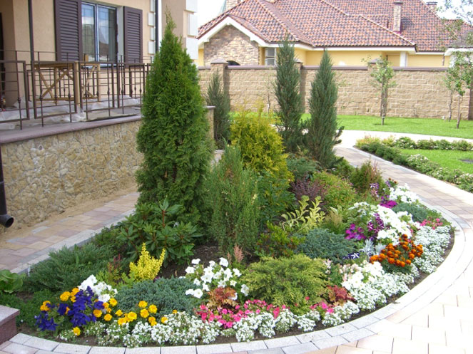 A flower bed with conifers will be an excellent option for decoration of a small garden plot or a country cottage. A similar version of the composition is especially loved by gardeners for being able to place it with minimal cost on standard several hundred square meters.