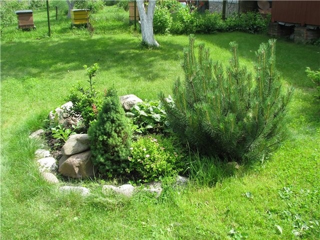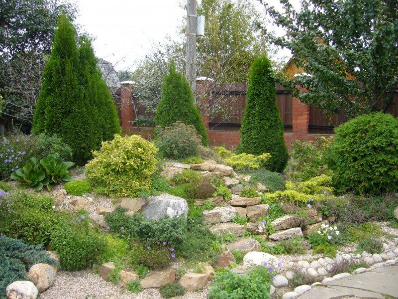 In English, preference is given to grasses, bushes and creeping coniferous species. Japanese emphasize the pattern of stones and gravel, occasionally diluted with greenery. European rockeries are the most common in the middle lane. Its semantic center, as a rule, is a vertical conifer of a conical or oval shape, around which other elements are placed - stones, creeping bushes, spherical trees lower.