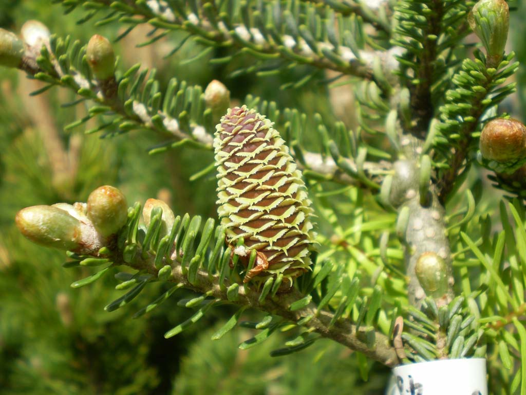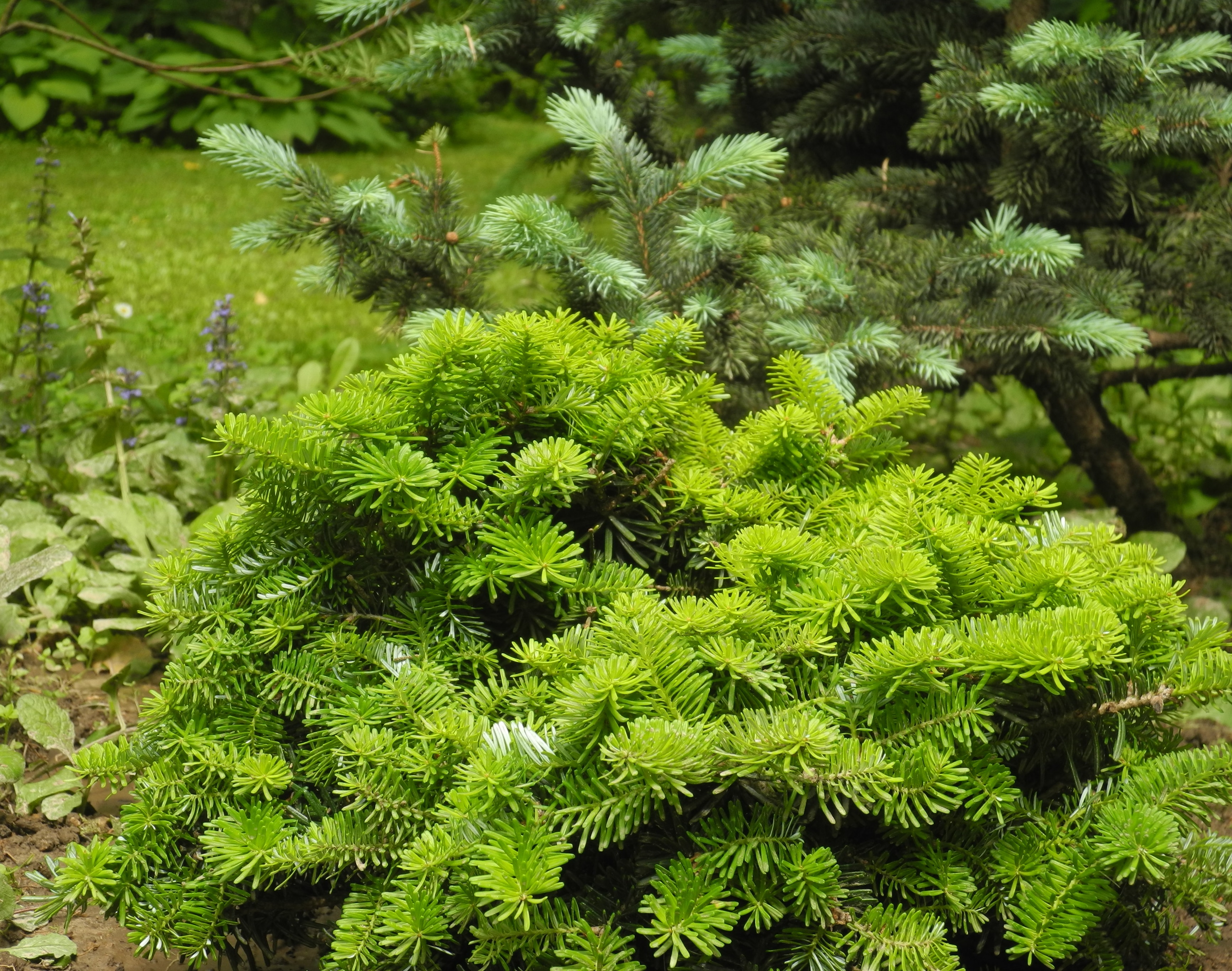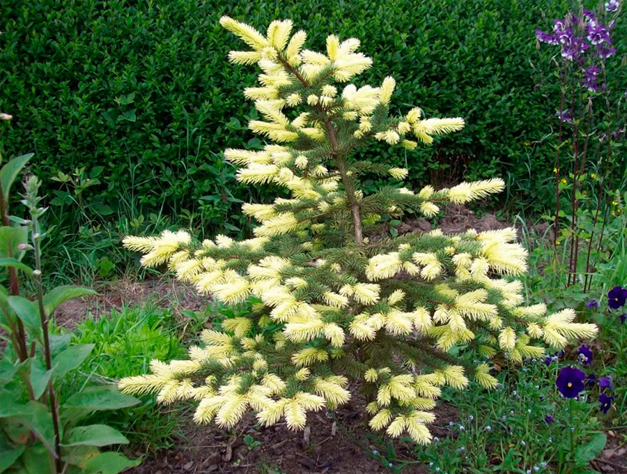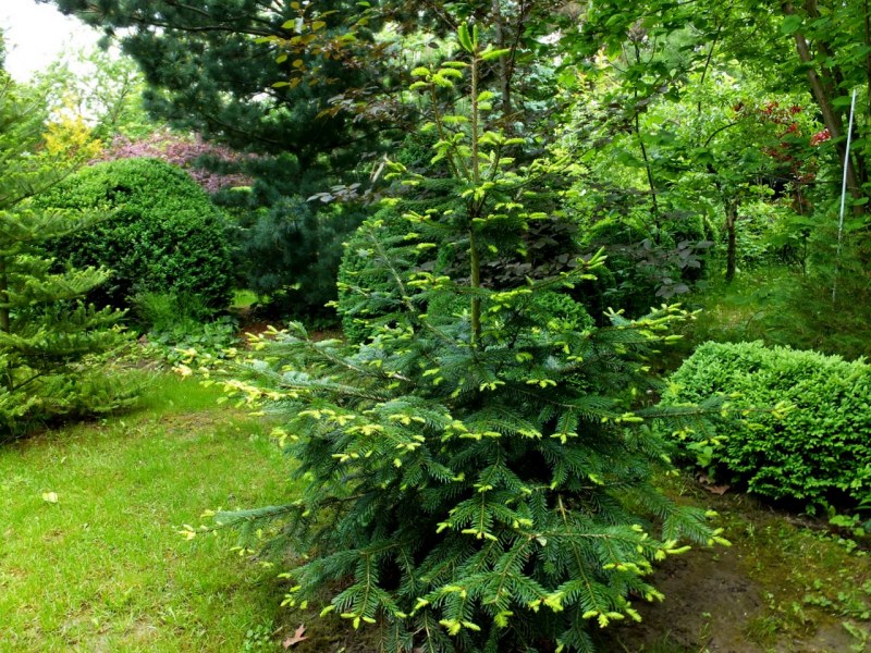 This tree is distinguished by dense needles and characteristic cones on the branches, which makes it a real pearl of any flowerbed. However, unlike the previous ones, fir is quite demanding on the soil, does not like polluted air and cold, needs regular watering.