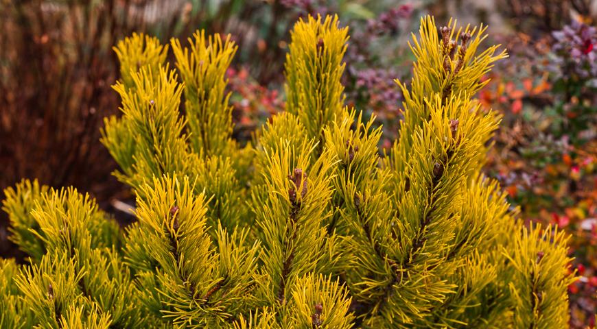 Pine is one of the most common and famous trees. It is unpretentious to the soil and climate, but requires a lot of space for its elegant crown. There are many varieties of dwarf pines, including creeping mountain pine, which allows its use both in compositions and as a lonely growing tree.Of the popular ones, there is a dwarf fluffy pine named Nana, a spherical twisted Waterrerie and Panderosis with long yellowish needles.