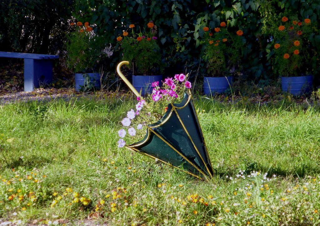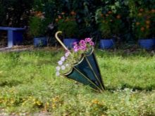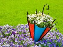 The following two examples look no less original. The first flower bed is located inside the umbrella. The inverted old umbrella is filled with earth. In this flowerbed, you can grow any plants, but preference is given to small instances, filling, if desired, free space with small stones.