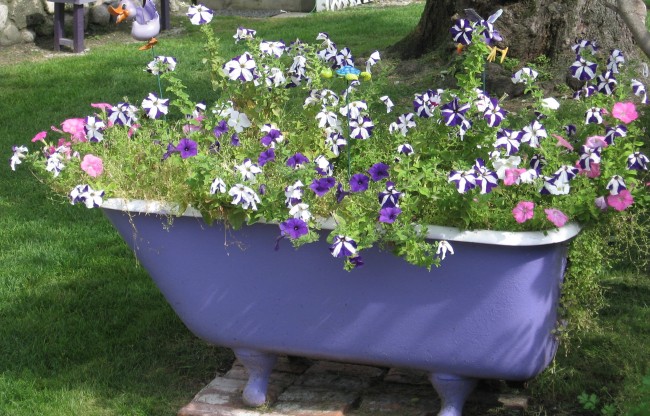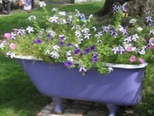 If you want a larger flower bed, you can use an old bath under it. This original solution will organically complement the site in a rustic style and amuse both you and everyone who will come to visit you. You don’t have to mess around with such a flowerbed - just fill it with a huge amount of earth, and then plant your favorite flowers there. Especially beautiful will look the finished composition, if you also paint the bath, adjusting it to the color of the petals.
