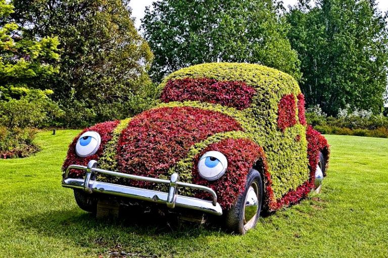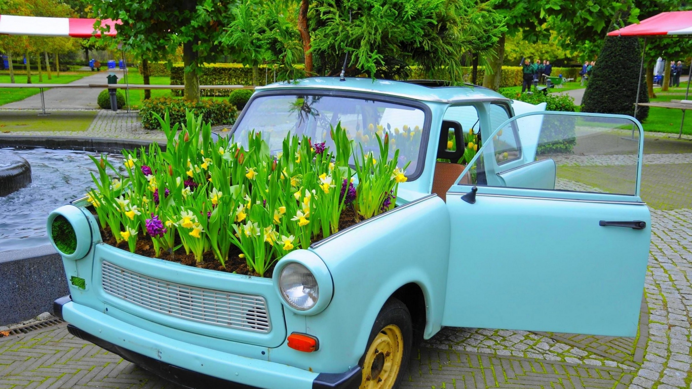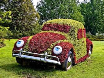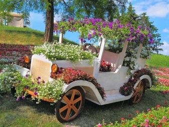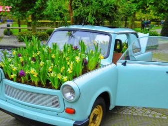 The main type of flowers - curly, because they are so beautifully braided all around, covering the shabby details of a dense floral carpet. And in the cabin there is enough space for simple colors that can be admired through the windows of the car. Such an original flower bed is proof that nature still conquers all technologies, no matter how ubiquitous.