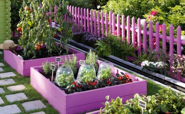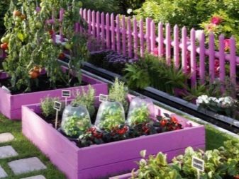 The next option is no less simple in execution, but it fascinates at first sight, without leaving anyone indifferent. To make such a vegetable garden on your site, you do not have to make special efforts. It is enough to knock down simple square flowerbeds from the boards, and then paint them in your favorite color. The pick-up allows you to perceive this area with flowers and a vegetable garden as a whole.
