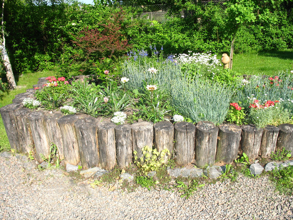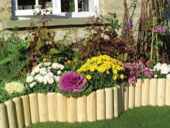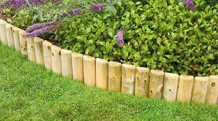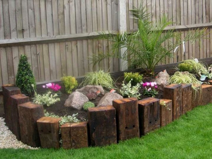 Wooden fences look more natural than from other materials. They are quite tolerant to the sun and harmless to flowers. The tree is easy to process. In addition, this material can be used in any form: both fragments of branches and old logs will be useful.