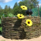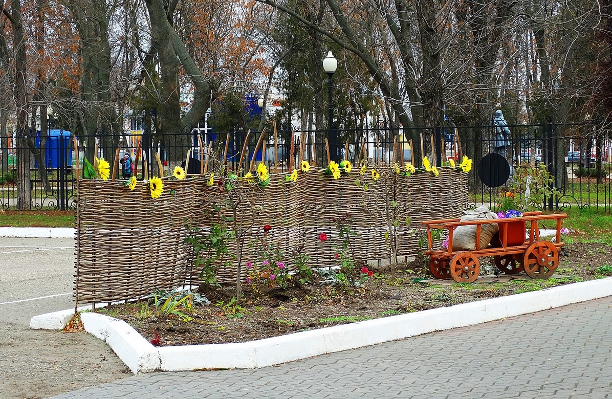 If there are no natural materials for the fence, use PVC pipes. Make a base, hammer the stakes into the ground at the length indicated above. Begin to braid with needles stakes from below. To make a wicker fence really colorful, you can plant sunflowers next to it. This is a traditional design trick. In urban areas, even plastic flowers will not cause confusion, and they will not have to care for them.