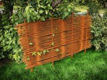 The wattle fence can be made an interesting designer addition to a solid metal fence. Metal fencing, decorated with decorative elements, has a protective function, and the fence creates a feeling of comfort and rustic simplicity.