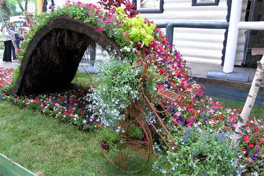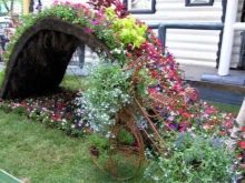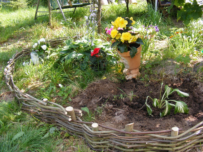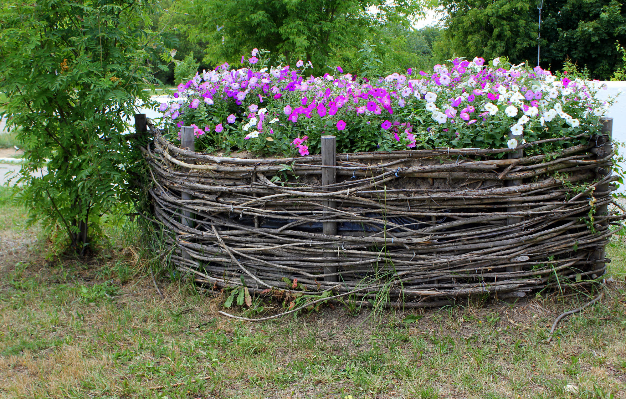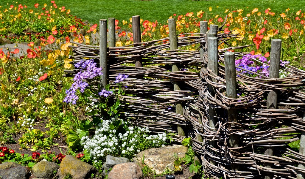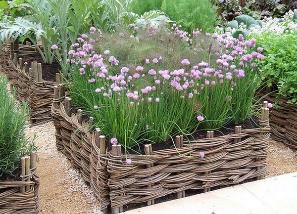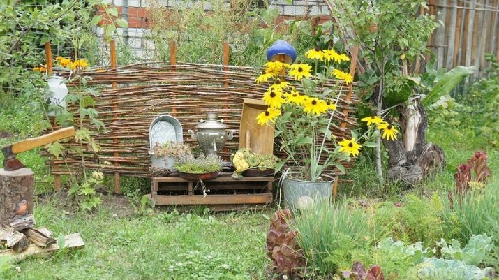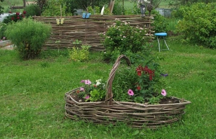 Wattle can be not only the original frame of the flowerbeds, but also part of the flower arrangement. All you need is to place the wicker elements among the flowers.