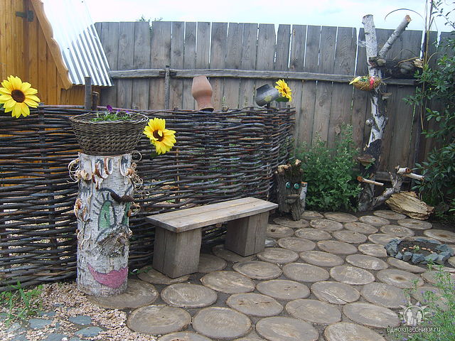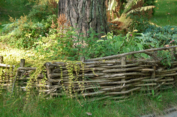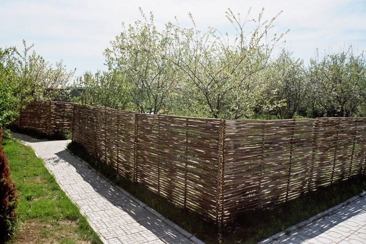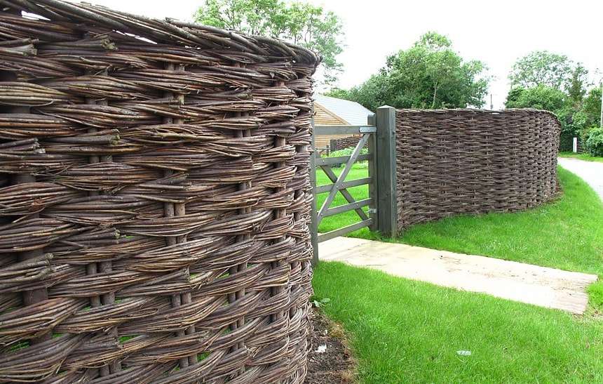 There are many ways of weaving from branches. They can be used not only for creating original baskets, but also for building fences. All these numerous techniques are used in landscape design. A woven fence can look very textured, if selecting each row with several layers of branches, create a chess pattern on the surface of the fence. A high wattle fence will not only decorate the territory, but also hide it from prying eyes.