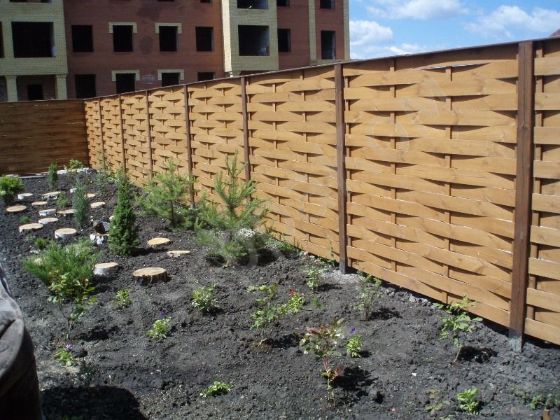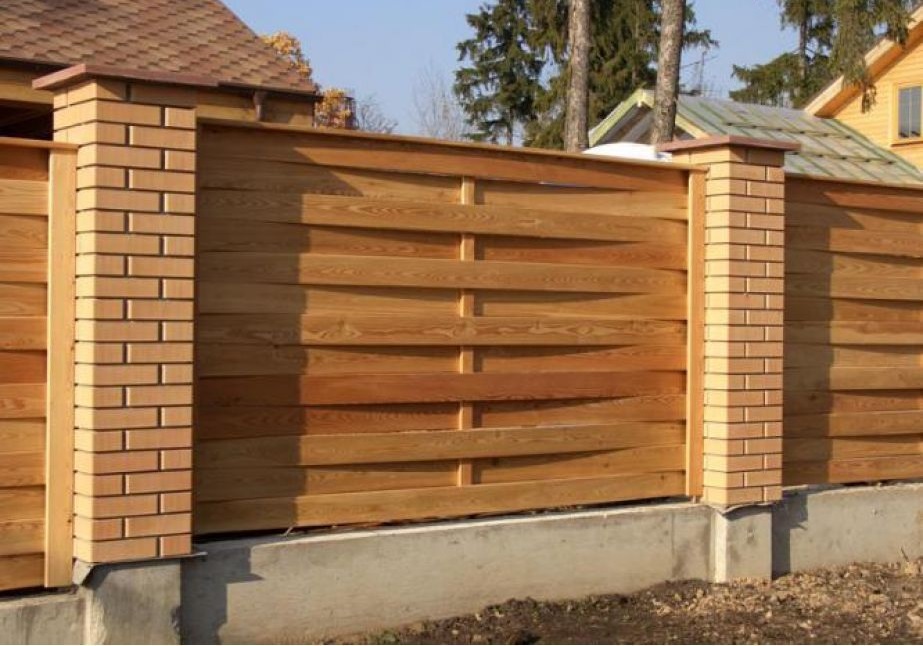 Wooden wooden fence of interlaced boards, combined with massive brick supports is a very solid and beautiful structure. By its appearance, such a fence makes it clear that the owners of the house are wealthy and economic people.