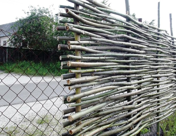 To create a vertical fence, several branches are horizontally tied to the pegs of the base, which will serve as slats for fasteners of other branches that make up the fence “body”. The branches used directly at weaving are put vertically, the thick party having rested against the earth. They need to braid horizontal slats. From above they must be tied with wire or rope.
