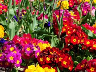 - A flower bed of primroses - this delicate composition of spring flowers will decorate any garden.Planted primula islands, which are located close to each other. They begin to bloom from early spring, and finish in the middle of summer.