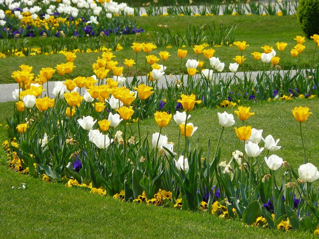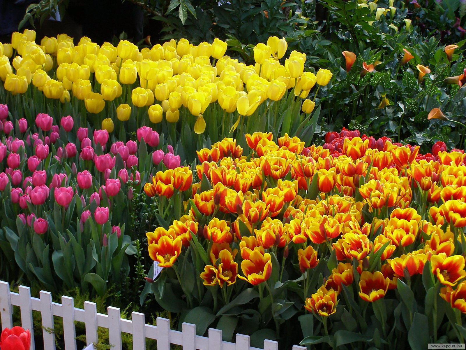 - Tulip flower bed - this is the most popular flower garden of the spring period, which usually consists of a single flower. Tulip bulbs are planted in the fall to a depth of 10-20 cm. They begin to bloom from late February to April or May, it all depends on the type and natural conditions. These bright, so attractive flower beds delight the eye for a long time. Many housewives planted several species, then the flowerbed looks even more spectacular.