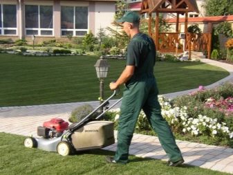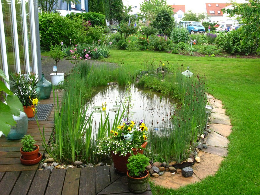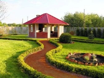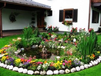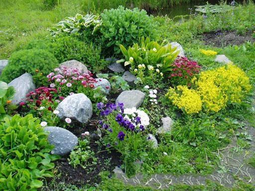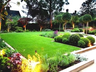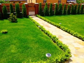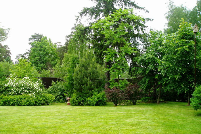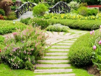 Lawn grass is often planted along garden paths, and isolated areas are planted for flowers and other ornamental plants. An example of this approach you can see in the photo; shrubs, low dense “cushions”, and tapeworms, including near the water, are used for landscaping.