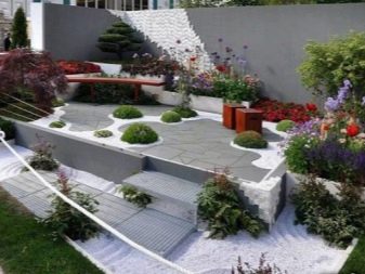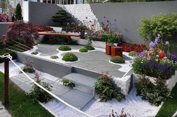 Speaking of different types of flower gardens, it should be mentioned about the style high tech; it is created, of course, not by saturating the space with high-tech components. There are completely different means, the use of which allows you to create a convenient, easy and comfortable care object. Abundantly applied glass, concrete and plastic structures; a mandatory feature of the style is rigor, even the severity of geometric contours.