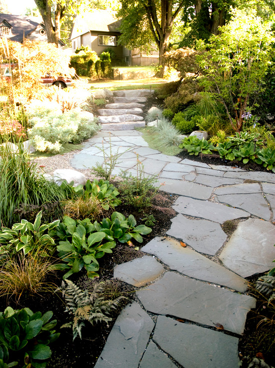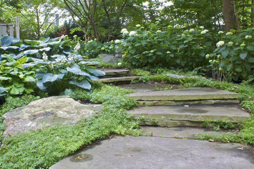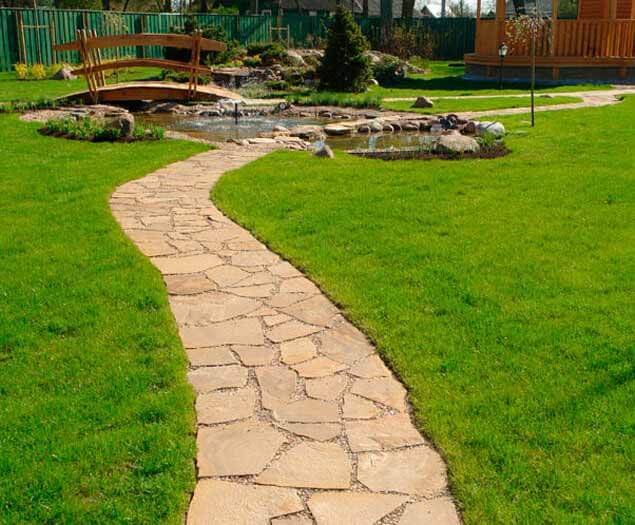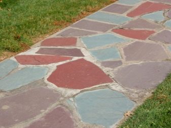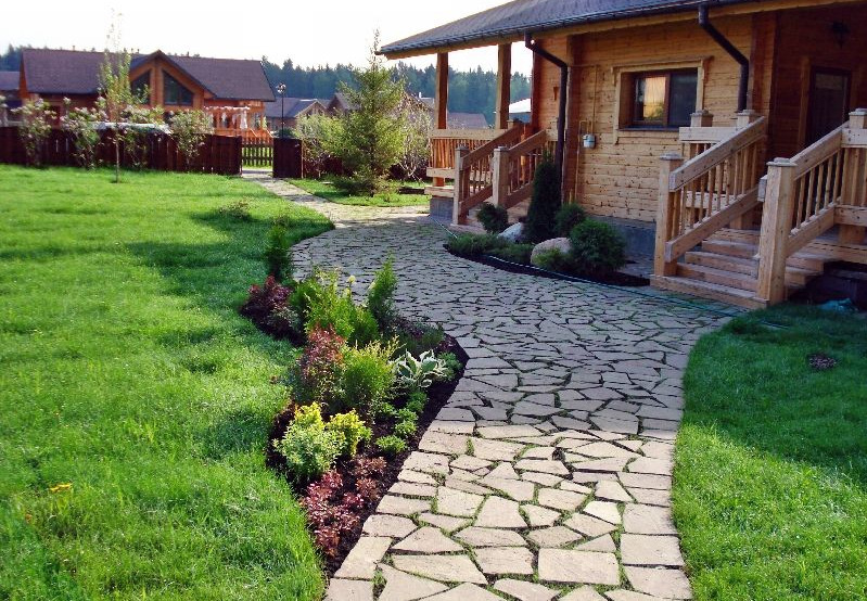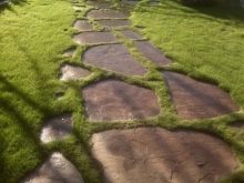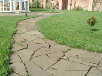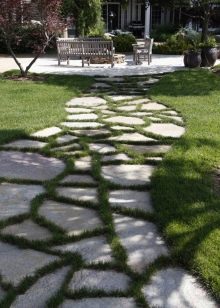 There are several types of natural stone: slate, quartzite, granite, sandstone, shungite. A stone with gaps filled with lawn grass creates a warm and comfortable passage through the territory. The disadvantages of this paving include the high cost of the material. For the budget option is better to use paving slabs.