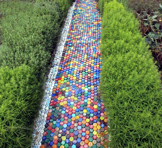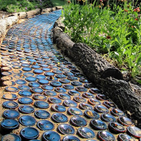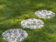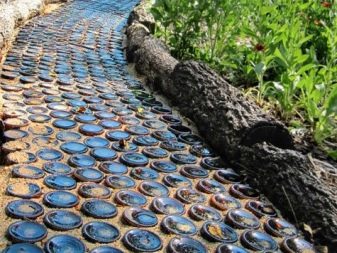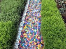 The original pattern can be laid out from the multicolored caps from plastic bottles into the still not frozen cement. True, it is necessary to make an effort to collect them. However, the result will be bright and exclusive. If a river flows nearby,the surface of the concrete path can be laid out with stones-naked or seashells.