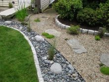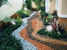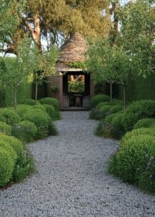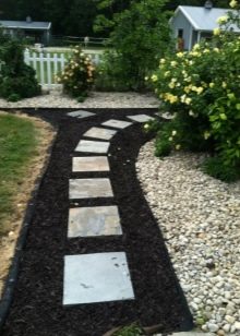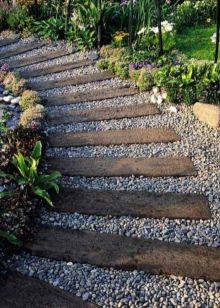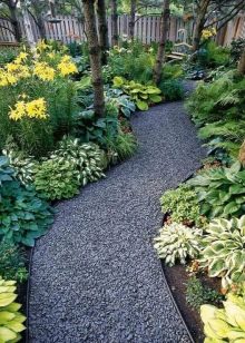 Soft paths on the plot are covered with gravel and rubble. For the base they dig a shallow trench, tamp the bottom, put geotextiles and fill gravel or gravel. Here it is better to install curbs so that small pebbles do not spread over the territory. This kind of path looks especially impressive when using gravel of different colors.
