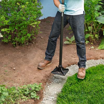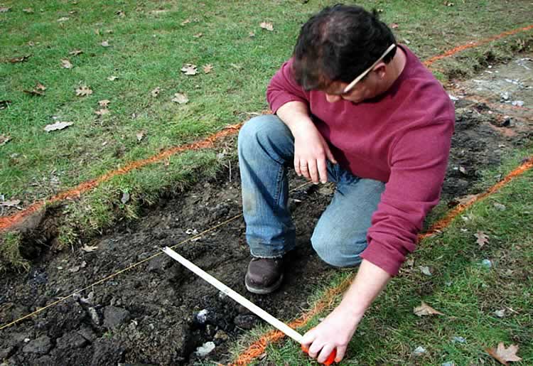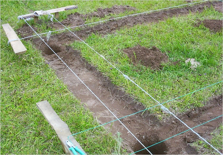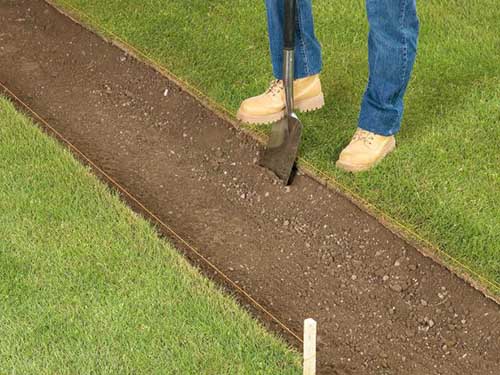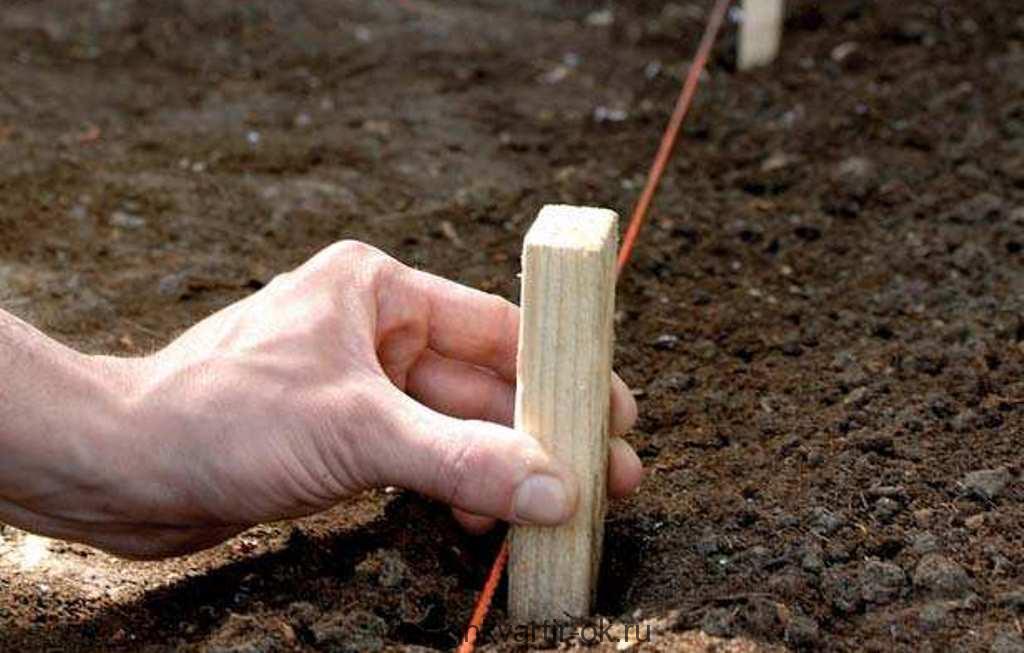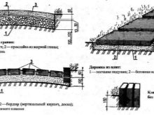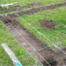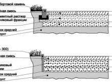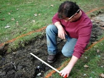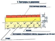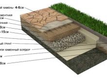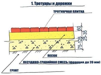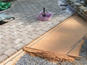 Soil is chosen to a depth of 25 cm, the bottom of the trench is tamped by hand or mechanically by means of vibrating rammers. For the manual method, a special tamper is made of a log with a nailed cross bar instead of pens. The bottom of the trench is lined with geotextile to isolate weeds. A layer of sand (5 cm) is poured, after tamping, a layer of rubble is laid on it (from 5 to 10 cm), rammed and covered with sand.