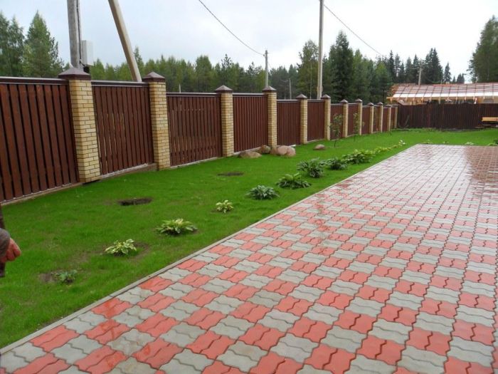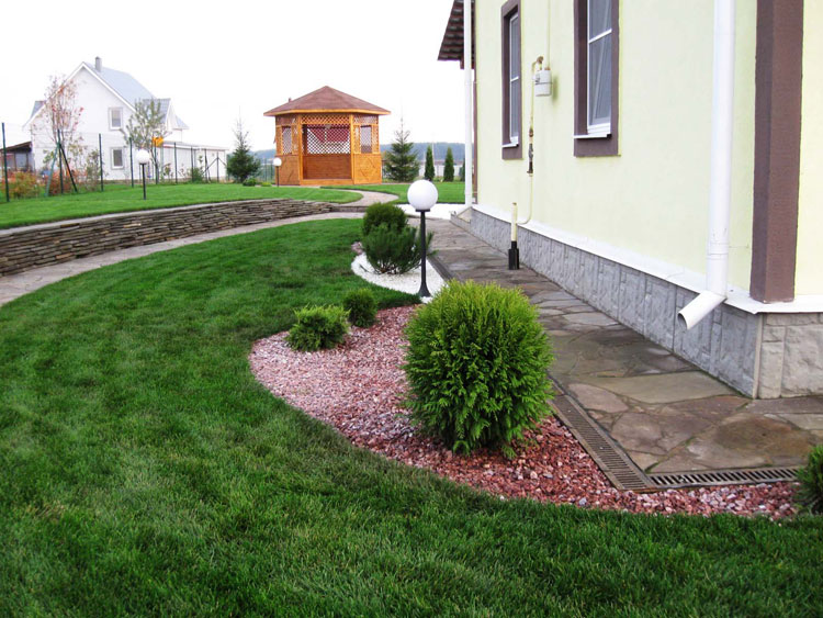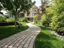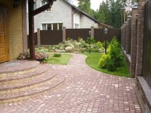 The color scheme of the finishing material is selected at the planning stage. You need to rely on the basic colors of the environment. A house surrounded by dark green coniferous trees will require gray, dark stone paths or trim in the color of dried pine needles. The pattern of paving plays an important role in the overall perception of the landscape. For example, country-style cottages can be decorated with brick or homemade mosaic paths. Children will love the soft rubber tire tracks.