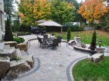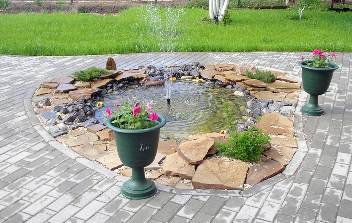 After that, spill water to the sand well filled the voids between the stones. After drying, it is again sprinkled with sand with a layer of 5 cm, followed by a layer of cement-sand mixture (5 cm). Finishing material is laid on this layer (natural stone, brick or slabs). Rammed and covered with cement mixture.Spill water and re-fill the cement mixture until it reaches the desired level of alignment.