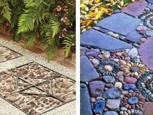 For many years, a bright mosaic on the paths will be pleasing to the eye, raising the mood in cloudy weather. Ceramics and glass are durable, mosaic fragments can be easily repaired, replacing parts with new ones. Self-pouring concrete forms, you can decorate them with an unusual mosaic of glass or pebbles. Design options weight.