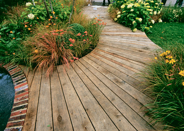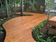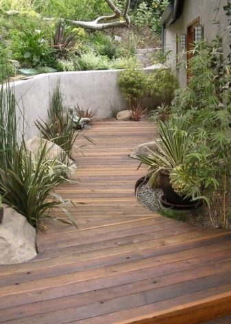 You can assemble the parquet flooring yourself. The use of decking boards for the decoration of paths from natural or polymeric materials will not hit the budget. Decking requires the preparation of a base from a concrete screed or sand and gravel pad. Garden parquet requires thorough care, it must be protected from moisture, regularly impregnated with special compounds. Especially valuable wood species need to be dismantled for the winter.
