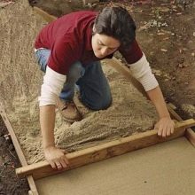 The bottom of the trench is leveled and checked on the construction level, so that there are no holes and bulges. It is necessary to monitor the overall slope of the track for the runoff of water (5 degrees). If this slope is not possible to provide, provide slopes of the fabric of the finishing material to the sides (5 to 15 degrees). The bottom of the trench is tamped with a log with a nailed bar or a mechanical tamper.